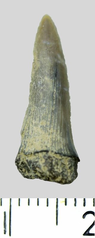 Зуб (фрагмент). Акула. Striatolamia ex. gr. teretidens (White, 1931). Классификация: Хордовые Chordata, Позвоночные Vertebrata, Хрящевые рыбы Chondrichthyes, Пластиножаберные Elasmobranchii