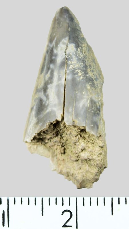 Зуб (фрагмент). Акула. Otodus subserratus (Agassiz, 1843). Классификация: Хордовые Chordata, Позвоночные Vertebrata, Хрящевые рыбы Chondrichthyes, Пластиножаберные Elasmobranchii