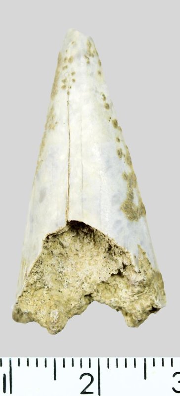 Зуб (фрагмент). Акула. Otodus subserratus (Agassiz, 1843). Классификация: Хордовые Chordata, Позвоночные Vertebrata, Хрящевые рыбы Chondrichthyes, Пластиножаберные Elasmobranchii