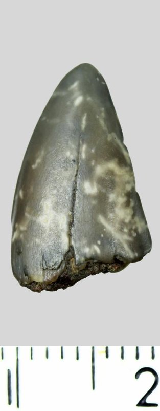 Зуб (фрагмент). Акула. Otodus subserratus (Agassiz, 1843). Классификация: Хордовые Chordata, Позвоночные Vertebrata, Хрящевые рыбы Chondrichthyes, Пластиножаберные Elasmobranchii
