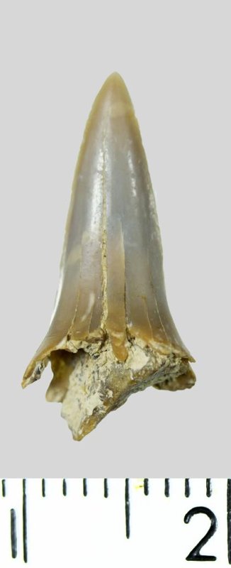 Зуб (фрагмент). Акула. Lamniformes gen. et sp. indet. Классификация: Хордовые Chordata, Позвоночные Vertebrata, Хрящевые рыбы Chondrichthyes, Пластиножаберные Elasmobranchii