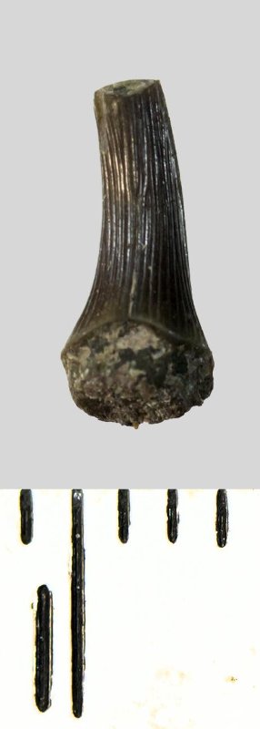 Зуб (фрагмент). Акула. Scapanorhynchus armenicus Glikman, 1980. Классификация: Хордовые Chordata, Позвоночные Vertebrata, Хрящевые рыбы Chondrichthyes, Пластиножаберные Elasmobranchii