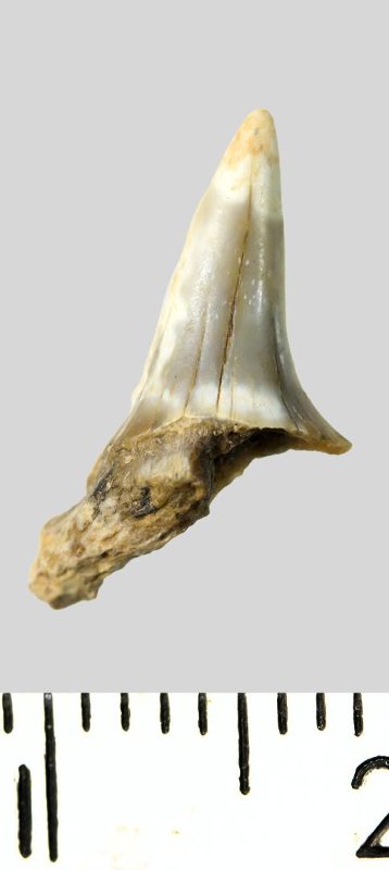 Зуб. Акула. Striatolamia striata (Winkler, 1874). Классификация: Хордовые Chordata, Позвоночные Vertebrata, Хрящевые рыбы Chondrichthyes, Пластиножаберные Elasmobranchii