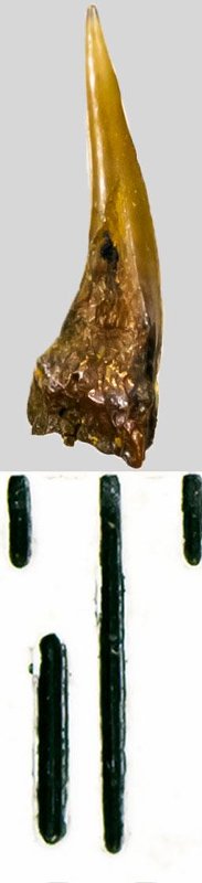 Коронка мелкого бокового зуба, темно-охристого цвета, режущего типа, S-образно изогнутая, с гладким режущим краем. Корень не сохранился.