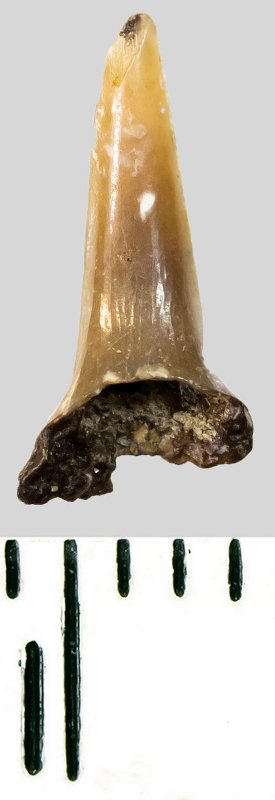 Зуб (фрагмент). Акула. Odontaspis striatula Dalinkevicius, 1935. Классификация: Хордовые Chordata, Позвоночные Vertebrata, Хрящевые рыбы Chondrichthyes, Пластиножаберные Elasmobranchii, Акулы Selachii, Ламнообразные Lamniformes, Песчаные акулы Odontaspididae