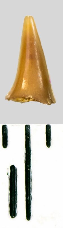 Зуб (фрагмент). Акула. Odontaspis striatula Dalinkevicius, 1935. Классификация: Хордовые Chordata, Позвоночные Vertebrata, Хрящевые рыбы Chondrichthyes, Пластиножаберные Elasmobranchii, Акулы Selachii, Ламнообразные Lamniformes, Песчаные акулы Odontaspididae