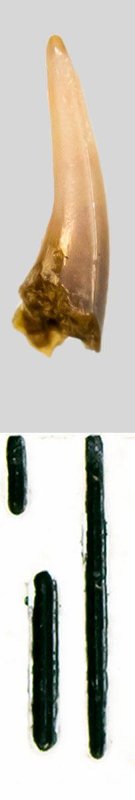 Коронка мелкого зуба, бежевого цвета, колюще-режущего типа, S-образно изогнутая, с гладким режущим краем. Корень не сохранился.