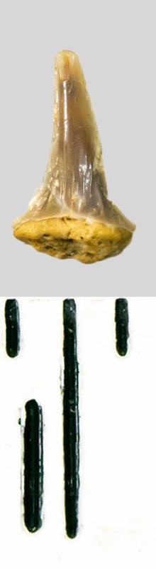 Зуб (фрагмент). Акула. Odontaspis striatula Dalinkevicius, 1935. Классификация: Хордовые Chordata, Позвоночные Vertebrata, Хрящевые рыбы Chondrichthyes, Пластиножаберные Elasmobranchii, Акулы Selachii, Ламнообразные Lamniformes, Песчаные акулы Odontaspididae