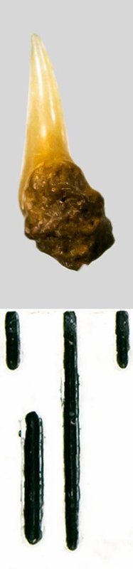 Коронка мелкого зуба, кремового цвета, режущего типа, S-образно изогнутая, с гладким режущим краем. Корень темно-охристый, сохранился фрагментарно.