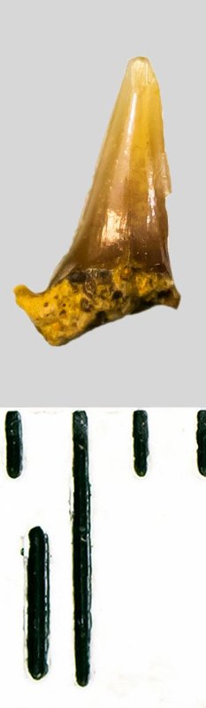 Зуб (фрагмент). Акула. Odontaspis striatula Dalinkevicius, 1935. Классификация: Хордовые Chordata, Позвоночные Vertebrata, Хрящевые рыбы Chondrichthyes, Пластиножаберные Elasmobranchii, Акулы Selachii, Ламнообразные Lamniformes, Песчаные акулы Odontaspididae