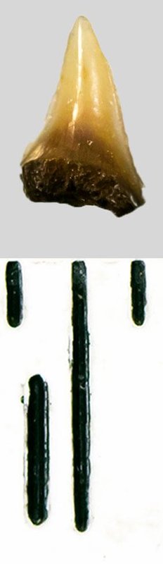 Зуб (фрагмент). Акула. Odontaspis striatula Dalinkevicius, 1935. Классификация: Хордовые Chordata, Позвоночные Vertebrata, Хрящевые рыбы Chondrichthyes, Пластиножаберные Elasmobranchii, Акулы Selachii, Ламнообразные Lamniformes, Песчаные акулы Odontaspididae