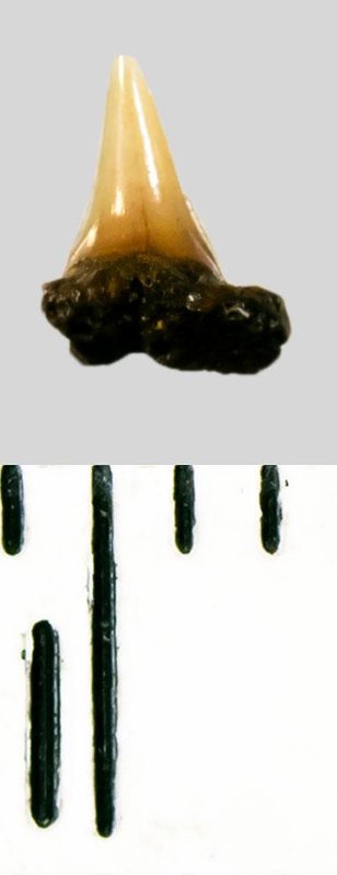 Мелкий боковой зуб с коронкой кремового цвета, режущего типа, S-образно изогнутой, с гладким режущим краем. Корень бурый, арочный, умеренно массивный, со следами окатанности; левая ветвь утрачена. С лингвальной стороны корня питательная борозда. Добавочные зубцы коронки отсутствуют.