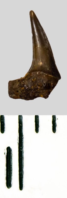 Мелкий боковой зуб с коронкой темно-оливкового цвета, режущего типа, S-образно изогнутой, с гладким режущим краем. Корень буро-охристый, арочный, умеренно массивный, со следами окатанности и эрозии; правая ветвь утрачена. Добавочные зубцы коронки отсутствуют.