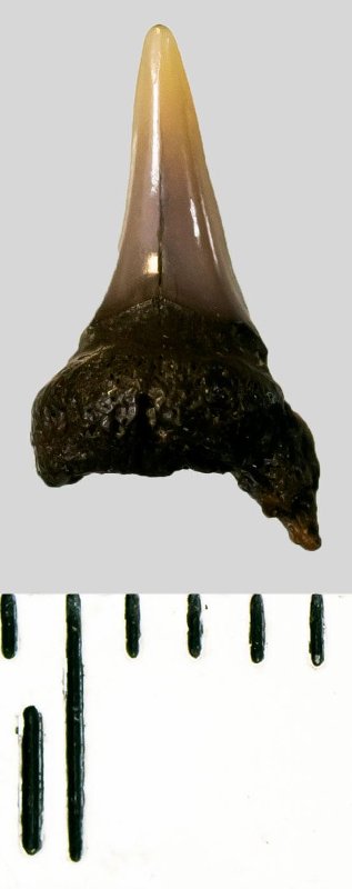 Мелкий боковой зуб с коронкой темно-бежевого цвета, рвуще-режущего типа, S-образно изогнутой, с гладким режущим краем. Корень охристый, арочный, умеренно массивный, со следами окатанности; левая ветвь утрачена. Добавочные зубцы коронки отсутствуют.
