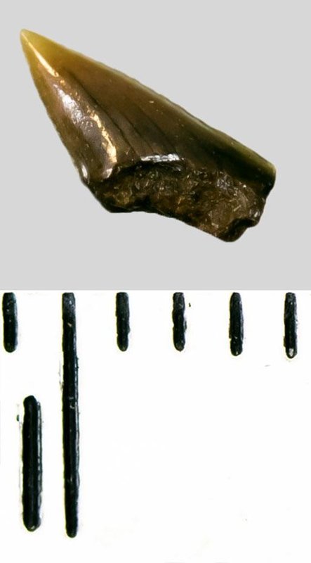 Коронка мелкого бокового зуба, темно-коричневого цвета, режущего типа, сильно скошенная, без скульптуры, с гладким режущим краем. Корень не сохранился.
