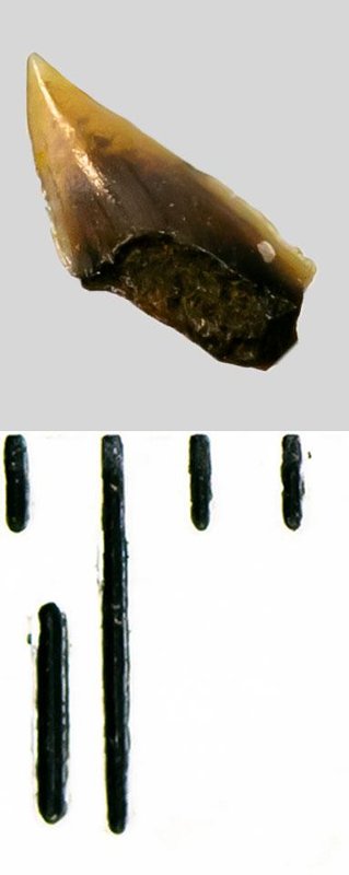 Коронка мелкого бокового зуба, темно-бежевого цвета, режущего типа, сильно скошенная, без скульптуры, с гладким режущим краем. Корень не сохранился.