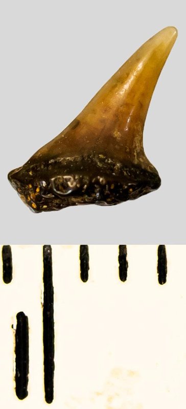 Коронка мелкого бокового зуба темно-коричневого цвета, режущего типа, S-образно изогнутая, с гладким режущим краем. Корень черный, сильно окатанный, сохранился фрагментарно.