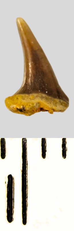 Коронка мелкого бокового зуба бурого цвета, режущего типа, S-образно изогнутая, с гладким режущим краем. Корень темно-охристый, сильно окатанный, сохранился фрагментарно.