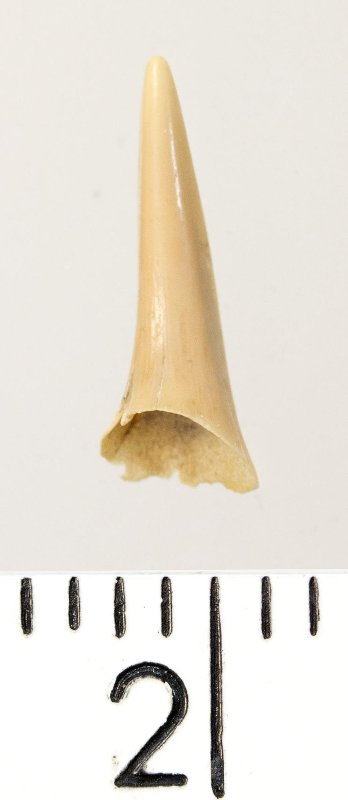 Коронка мелкого зуба светло-охристого цвета, колюще-режущего типа, S-образно изогнутая, с гладким режущим краем. Корень зуба не сохранился.