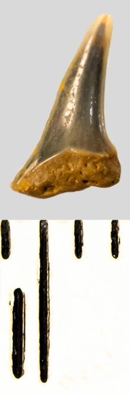 Коронка мелкого бокового зуба темно-серого цвета, режущего типа, S-образно изогнутая, с гладким режущим краем. Корень темно-охристый, сильно окатанный, сохранился фрагментарно.