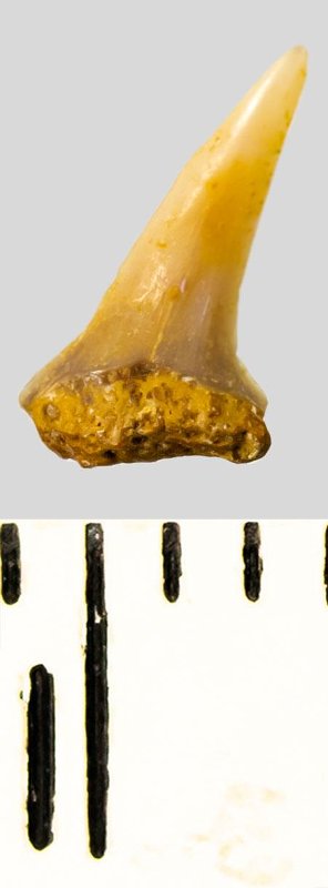 Коронка мелкого бокового зуба светло-охристого цвета, режущего типа, S-образно изогнутая, с гладким режущим краем. Корень охристый, сильно окатанный, сохранился фрагментарно.