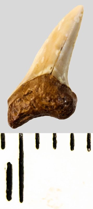 Коронка мелкого бокового зуба кремового цвета с белесыми вкраплениями, режущего типа, S-образно изогнутая, с гладким режущим краем. Корень бурый, сильно окатанный, сохранился фрагментарно.