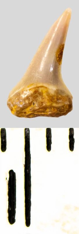 Коронка мелкого бокового зуба серого цвета, режущего типа, S-образно изогнутая, с гладким режущим краем. Корень темно-охристый, сильно окатанный, сохранился фрагментарно.