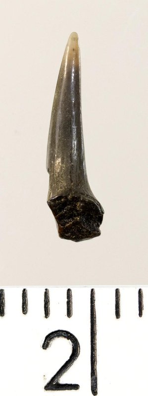 Коронка мелкого зуба темно-серого цвета, колюще-режущего типа, S-образно изогнутая, с гладким режущим краем. С лингвальной стороны у основания коронки на эмали имеется скульптура в виде слабой продольной струйчатости. Корень зуба не сохранился.