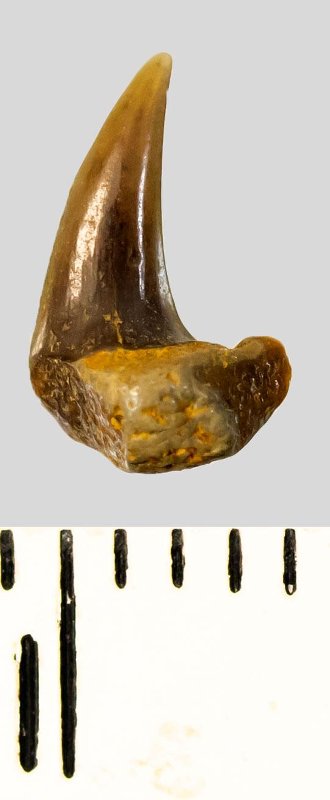 Коронка мелкого бокового зуба бурого цвета, режущего типа, S-образно изогнутая, с гладким режущим краем. Корень темно-охристый, сильно окатанный, сохранился фрагментарно.