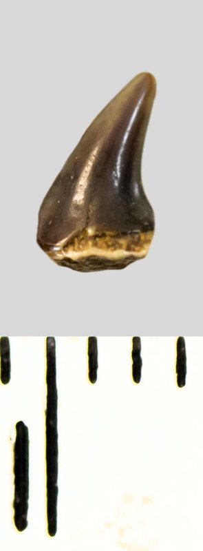 Коронка мелкого бокового зуба бурого цвета, режущего типа, S-образно изогнутая, с гладким режущим краем. Корень зуба не сохранился.