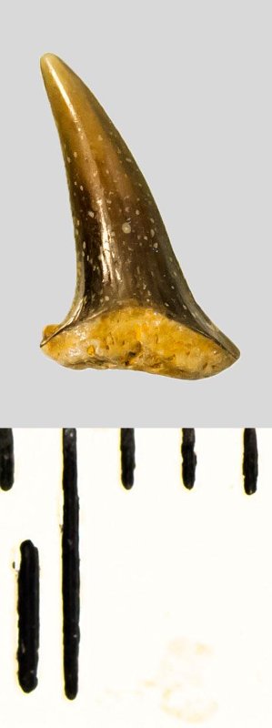 Зуб (фрагмент). Акула. Eostriatolamia subulata (Agassiz, 1843). Классификация: Хордовые Chordata, Позвоночные Vertebrata, Хрящевые рыбы Chondrichthyes, Пластиножаберные Elasmobranchii, Акулы Selachii, Ламнообразные Lamniformes, Песчаные акулы Odontaspididae