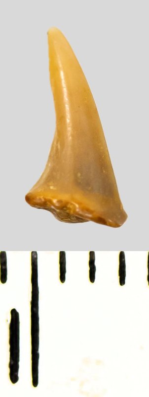 Коронка мелкого бокового зуба охристого цвета, режущего типа, S-образно изогнутая, с гладким режущим краем. Корень зуба не сохранился.