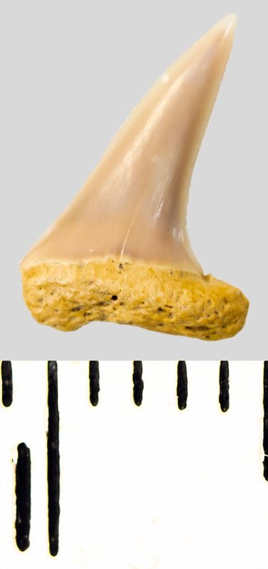 Мелкий боковой зуб с коронкой светло-серого цвета, режущего типа, S-образно изогнутой, с гладким режущим краем. Корень светло-охристый, арочный, умеренно массивный, со следами окатанности, левая ветвь утрачена. Добавочные зубцы коронки отсутствуют.