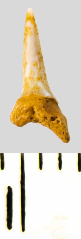 Мелкий боковой зуб с коронкой светло-серого цвета, колюще-режущего типа, S-образно изогнутой, с гладким режущим краем. Корень охристый, арочный, умеренно массивный, со следами окатанности, левая ветвь утрачена. Имеется одна питательная борозда с лингвальной стороны корня. Добавочные зубцы коронки отсутствуют.