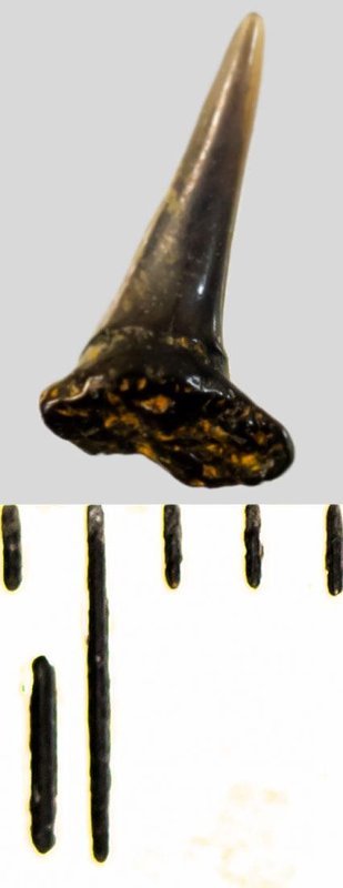 Мелкий боковой зуб с коронкой темно-серого цвета, колюще-режущего типа, S-образно изогнутой, с гладким режущим краем. Корень черный, арочный, умеренно массивный, со следами окатанности, левая ветвь утрачена. Добавочные зубцы коронки отсутствуют.