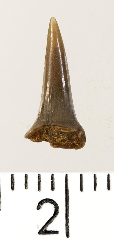 Зуб (фрагмент). Акула. Eostriatolamia subulata (Agassiz, 1843). Классификация: Хордовые Chordata, Позвоночные Vertebrata, Хрящевые рыбы Chondrichthyes, Пластиножаберные Elasmobranchii, Акулы Selachii, Ламнообразные Lamniformes, Песчаные акулы Odontaspididae
