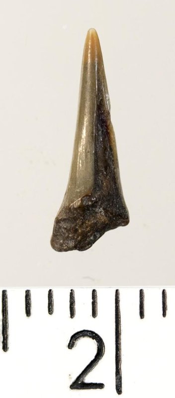Коронка мелкого зуба темно-оливкового цвета, колюще-режущего типа, S-образно изогнутая, с гладким режущим краем. С лингвальной стороны у основания коронки на эмали имеется скульптура в виде слабой продольной струйчатости. Корень зуба не сохранился.