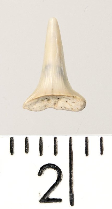 Зуб (фрагмент). Акула. Eostriatolamia subulata (Agassiz, 1843). Классификация: Хордовые Chordata, Позвоночные Vertebrata, Хрящевые рыбы Chondrichthyes, Пластиножаберные Elasmobranchii, Акулы Selachii, Ламнообразные Lamniformes, Песчаные акулы Odontaspididae
