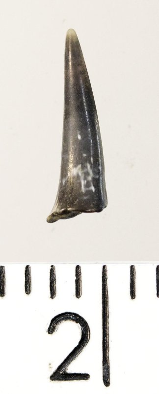 Коронка мелкого зуба темно-серого цвета, колюще-режущего типа, S-образно изогнутая, с гладким режущим краем. Корень зуба не сохранился.