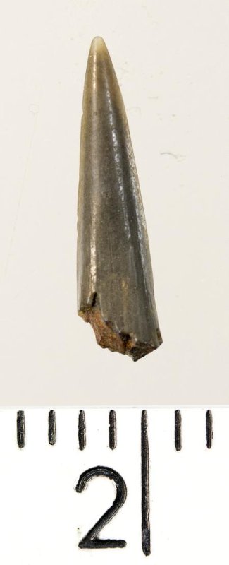 Коронка мелкого зуба темно-серого цвета, колюще-режущего типа, S-образно изогнутая, с гладким режущим краем. С лингвальной стороны у основания коронки на эмали имеется скульптура в виде слабой продольной струйчатости. Корень зуба не сохранился.