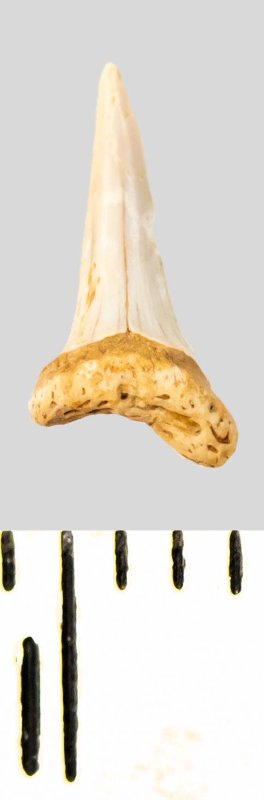 Мелкий боковой зуб с коронкой светло-серого цвета, колюще-режущего типа, S-образно изогнутой, с гладким режущим краем. Корень светло-кремового цвета, арочный, умеренно массивный, со следами окатанности, левая ветвь утрачена. Добавочные зубцы коронки отсутствуют.