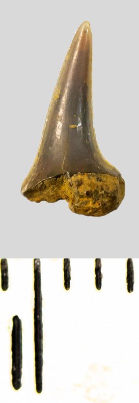 Мелкий боковой зуб с коронкой темно-серого цвета, режущего типа, S-образно изогнутой, с гладким режущим краем. Корень темно-охристый, сохранился фрагментарно. Добавочные зубцы коронки отсутствуют.