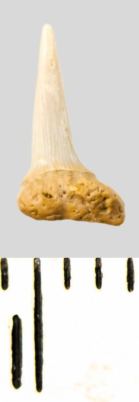 Зуб. Акула. Eostriatolamia subulata (Agassiz, 1843). Классификация: Хордовые Chordata, Позвоночные Vertebrata, Хрящевые рыбы Chondrichthyes, Пластиножаберные Elasmobranchii, Акулы Selachii, Ламнообразные Lamniformes, Песчаные акулы Odontaspididae