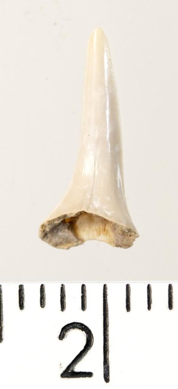 Зуб (фрагмент). Акула. Eostriatolamia subulata (Agassiz, 1843). Классификация: Хордовые Chordata, Позвоночные Vertebrata, Хрящевые рыбы Chondrichthyes, Пластиножаберные Elasmobranchii, Акулы Selachii, Ламнообразные Lamniformes, Песчаные акулы Odontaspididae