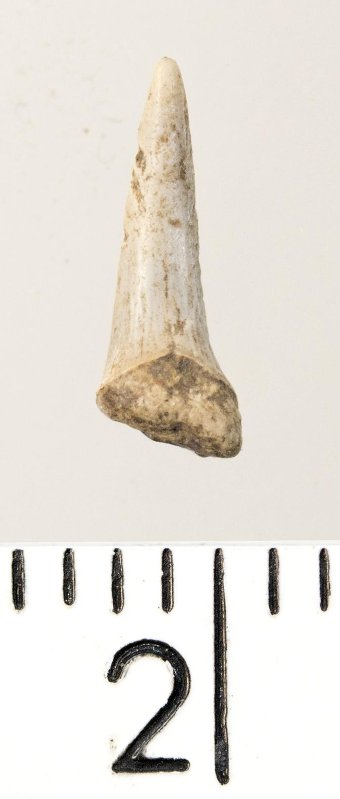 Коронка мелкого зуба светло-серого цвета, колюще-режущего типа, S-образно изогнутая, с гладким режущим краем. С лингвальной стороны у основания коронки на эмали имеется скульптура в виде слабой продольной струйчатости. Корень зуба не сохранился.