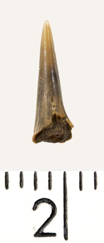 Зуб (фрагмент). Акула. Eostriatolamia subulata (Agassiz, 1843). Классификация: Хордовые Chordata, Позвоночные Vertebrata, Хрящевые рыбы Chondrichthyes, Пластиножаберные Elasmobranchii, Акулы Selachii, Ламнообразные Lamniformes, Песчаные акулы Odontaspididae