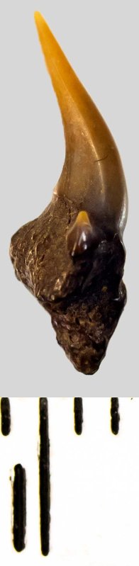 Мелкий симфизный? зуб с узкой коронкой темно-охристого цвета, колюще-режущего типа, S-образно изогнутой, с гладким режущим краем. Корень буро-охристый, арочный, умеренно массивный, со следами окатанности; правая ветвь утрачена. Имелась одна пара добавочных зубцов коронки, сохранился только правый.