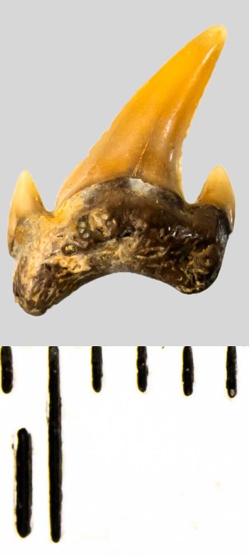 Мелкий боковой зуб с коронкой охристого цвета, режущего типа, S-образно изогнутой, с гладким режущим краем. Корень буро-охристый, арочный, умеренно массивный, со следами окатанности. Имеется одна пара добавочных зубцов коронки.