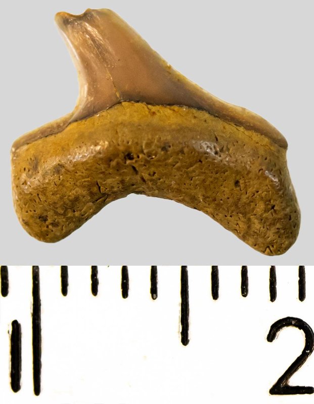 Средних размеров боковой зуб с коронкой темного, красновато-бежевого цвета, режущего типа, слегка S-образно изогнутой, без скульптуры, с гладким режущим краем. Корень темно-охристый, арочный, умеренно массивный, со следами окатанности. С лингвальной стороны корня питательное отверстие. Имеется одна пара добавочных зубцов коронки. Зубцы редуцированы до килей и слиты с основной вершиной.