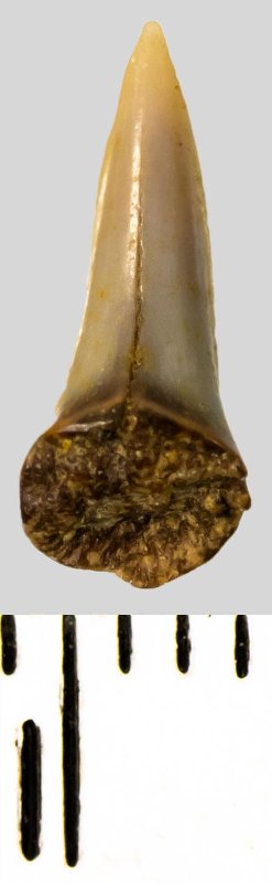 Зуб (фрагмент). Акула. Archaeolamna cf. kopingensis (Davis, 1890). Классификация: Хордовые Chordata, Позвоночные Vertebrata, Хрящевые рыбы Chondrichthyes, Пластиножаберные Elasmobranchii, Акулы Selachii, Ламнообразные Lamniformes, Cretoxyrhinidae